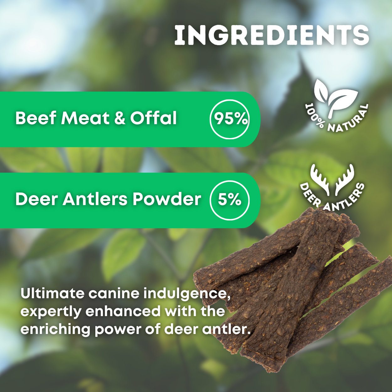 - Hergestellt aus hochwertigem Fleisch und Geweihpulver.