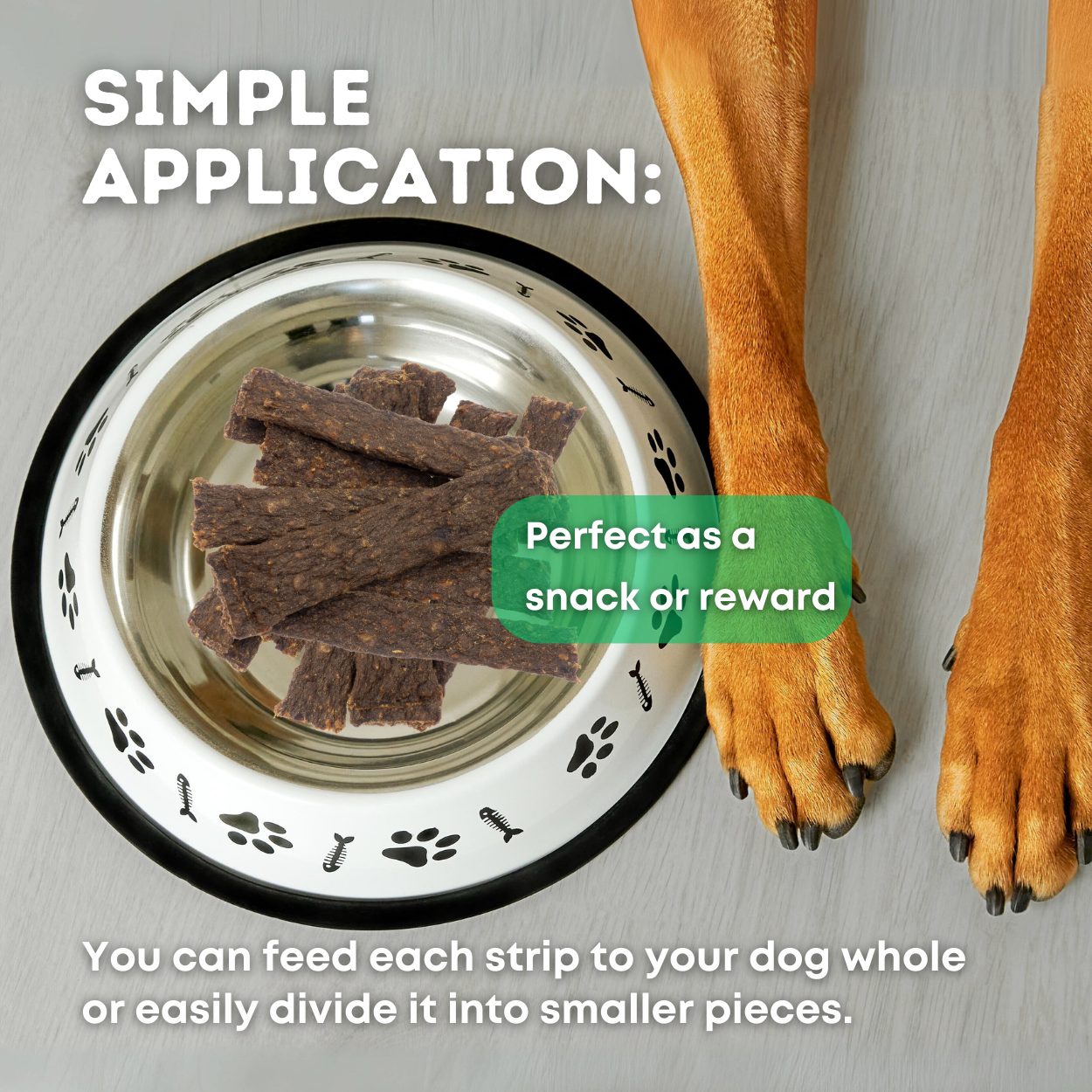 Aufbewahrung: Halten Sie diese köstlichen Streifen frisch, indem Sie sie an einem kühlen, trockenen Ort vor direkter Sonneneinstrahlung fernhalten. Bequemlichkeit trifft auf Qualität! Mögliche Ansprüche: Hochverdaulich. Einfach in der Anwendung: Sie können jeden Streifen Ihrem Hund im Ganzen verfüttern oder leicht in kleinere Stücke teilen.