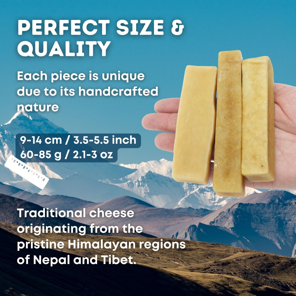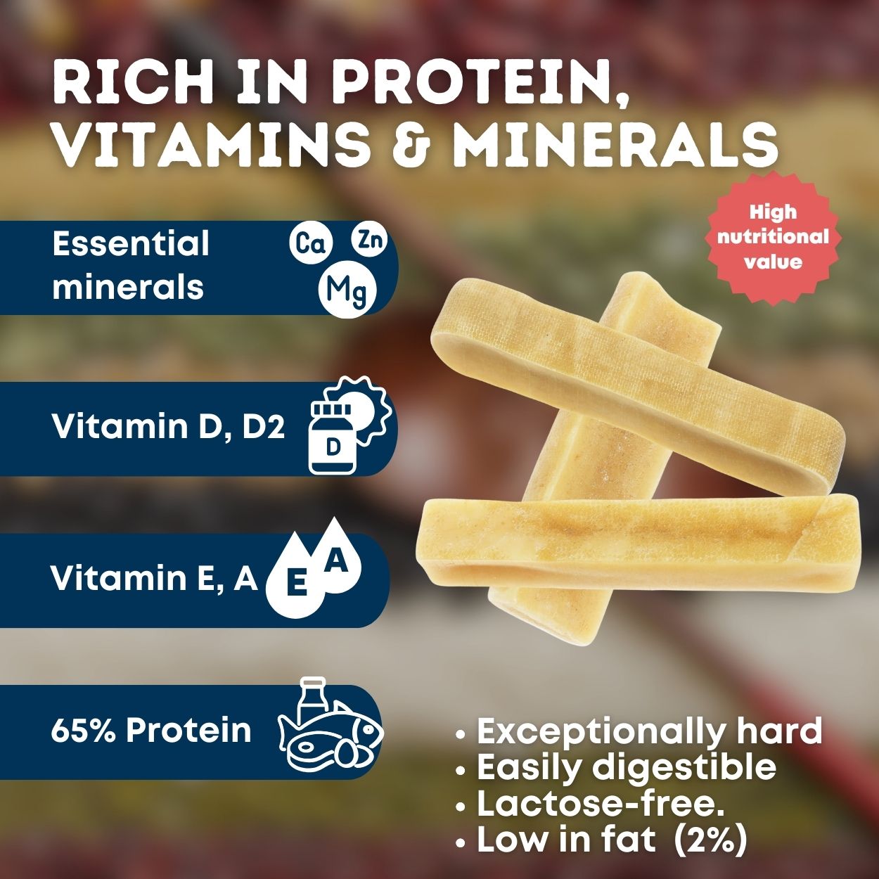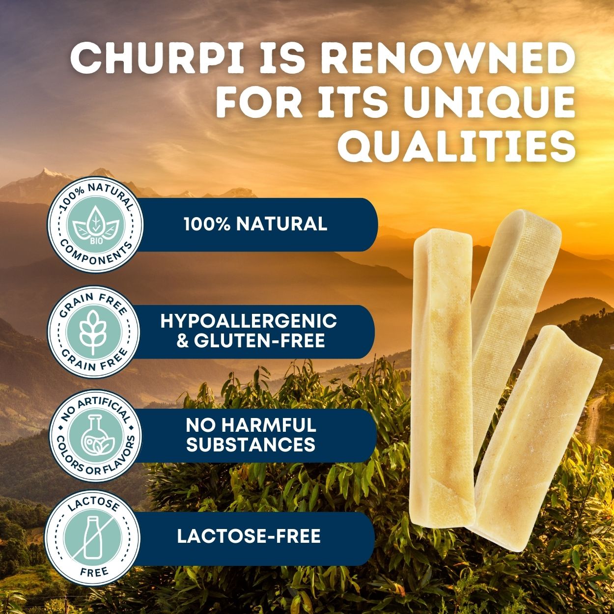 Churpi, auch Himalaya-Käse genannt, ist ein traditioneller Käse, der aus den unberührten Himalaya-Regionen Nepal und Tibet stammt. Churpi wird in einem jahrhundertealten Produktionsprozess hergestellt und ist für seine einzigartigen Qualitäten bekannt. Besonders hervorzuheben ist, dass Churpi leicht verdaulich ist und keine Laktose enthält, wodurch es für Hunde mit ernährungsempfindlichen Nahrungsmitteln geeignet ist. Himalaya-Käse ist außerdem reich an Proteinen und macht etwa 65 % seiner Zusammensetzung aus. Gleichzeitig hat es einen geringen Fettgehalt von ca. 2 % und ist laktosefrei. Churpi enthält außerdem Vitamin D, D2, Vitamin E, Vitamin A und essentielle Mineralien wie Phosphor, Kalzium, Natrium, Kalium, Zink und Eisen.