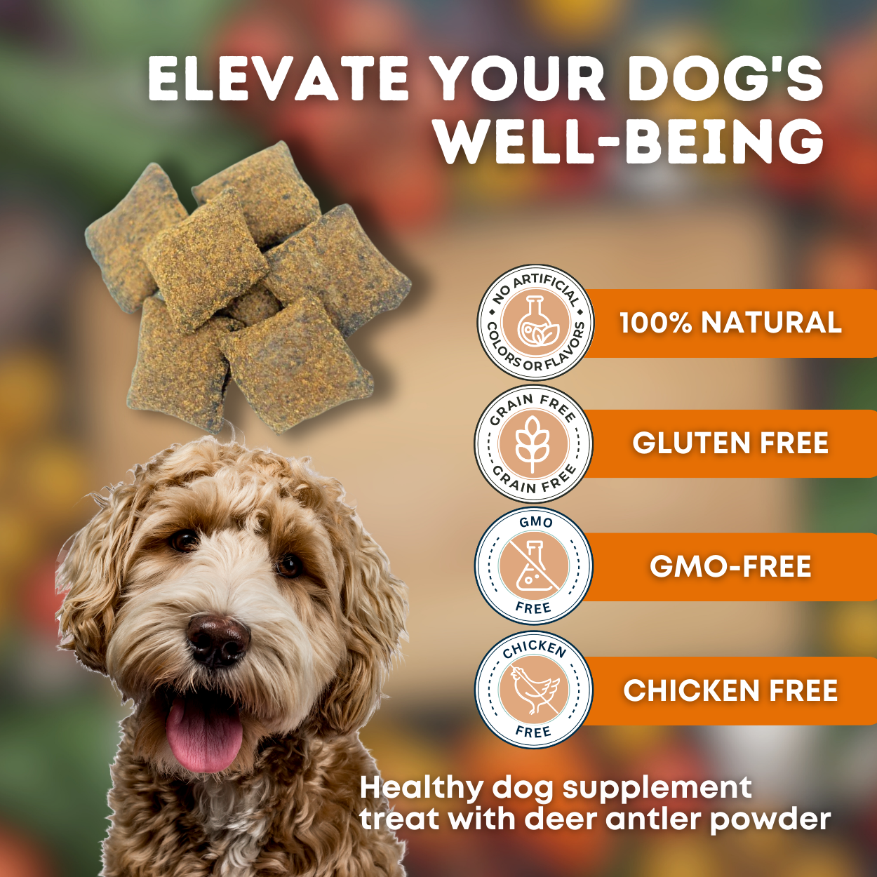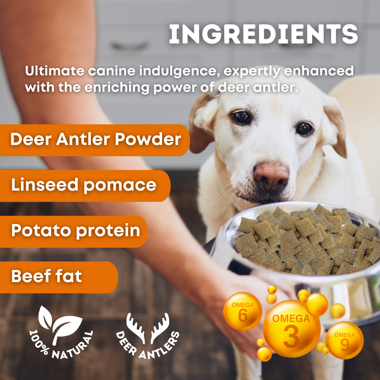 🦌 Hirschgeweih-Kraft : Das Besondere an diesen Leckereien ist die Zugabe von pulverisiertem Hirschgeweih. Sie bringen eine Vielzahl von Vorteilen mit sich, darunter einen erhöhten Nährwert, verbesserte physiologische Prozesse, einen verbesserten Gesamtzustand, eine Stärkung der Immunität und eine Geweberegeneration.